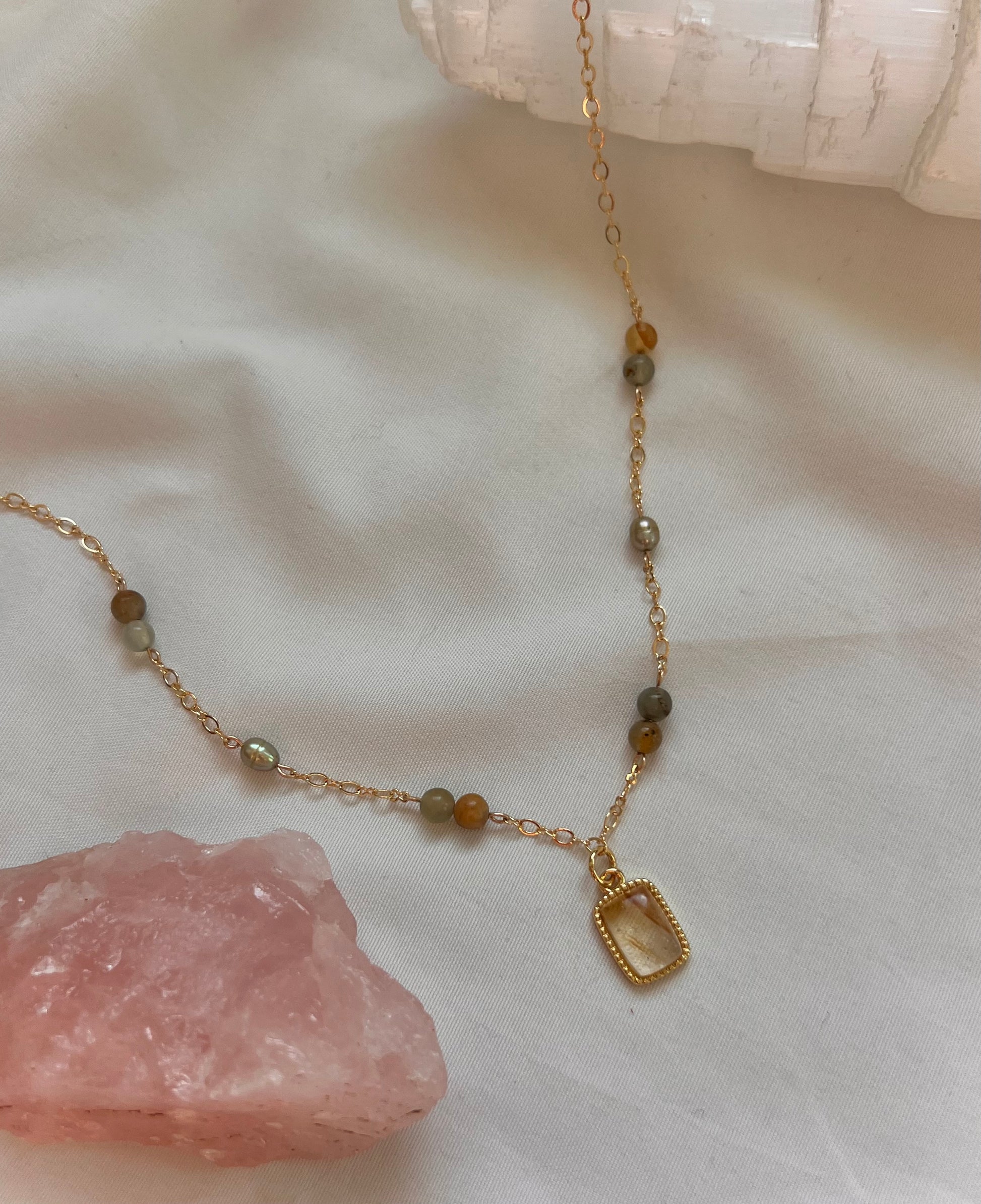 16” adjustable necklace with flower jade & fresh water pearl beads with citrine pendant