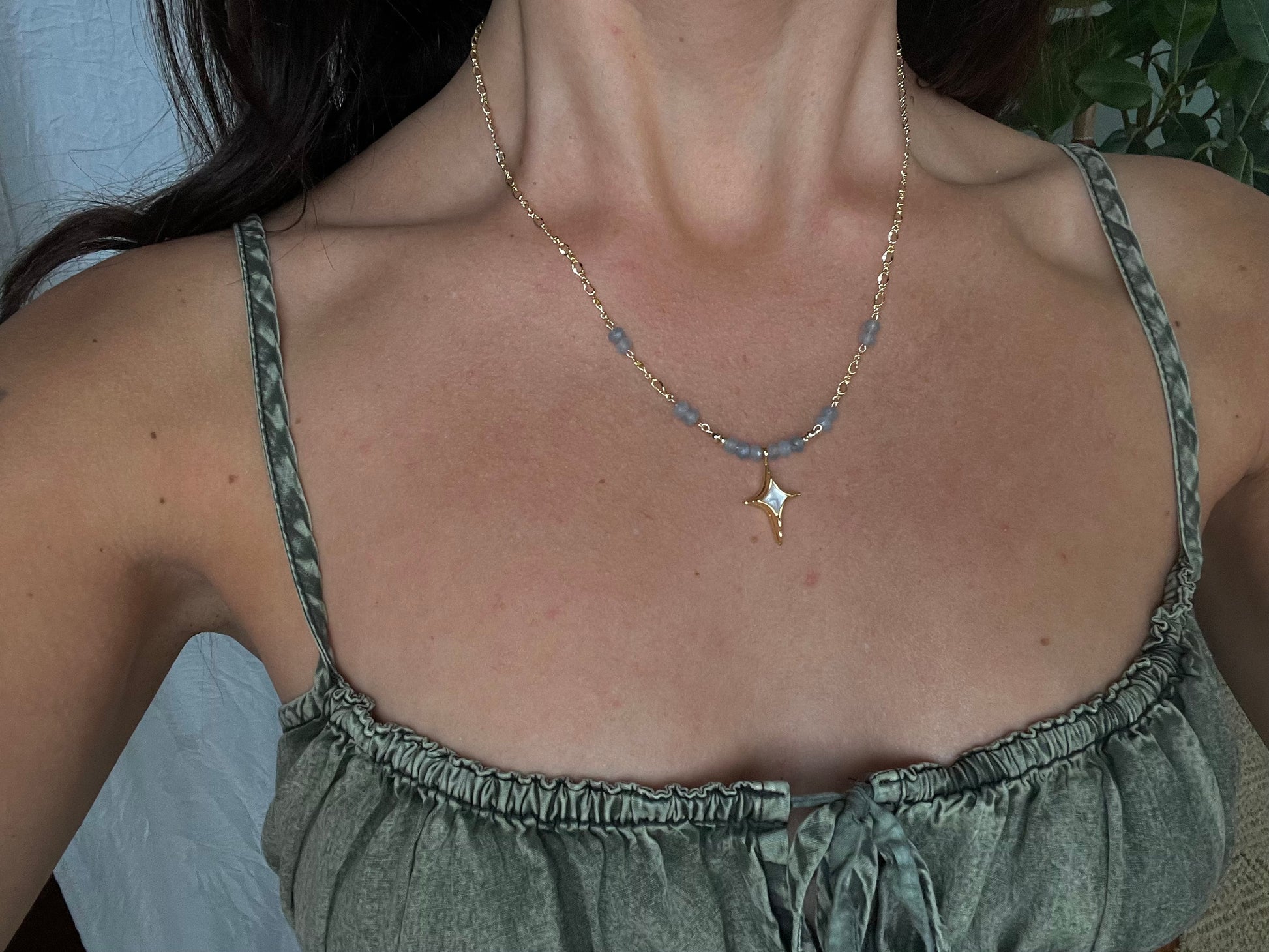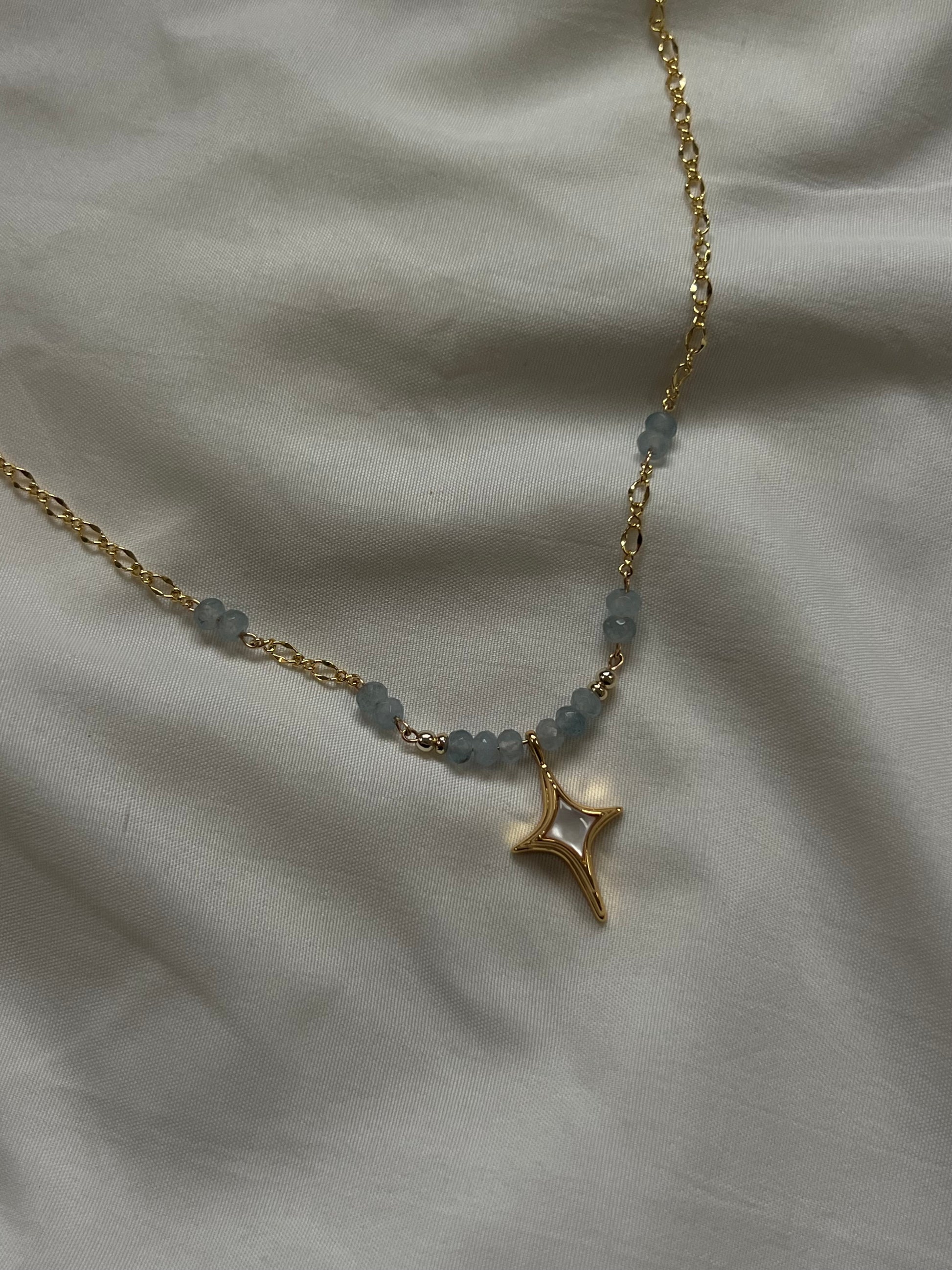 16” adjustable gold filled necklace with aquamarine beads & mother of pearl charm