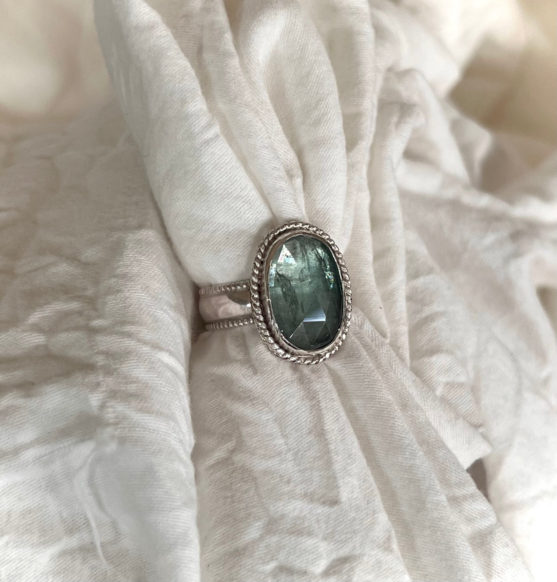 Created with .925 Sterling Silver & faceted Aqua Kyanite stone.