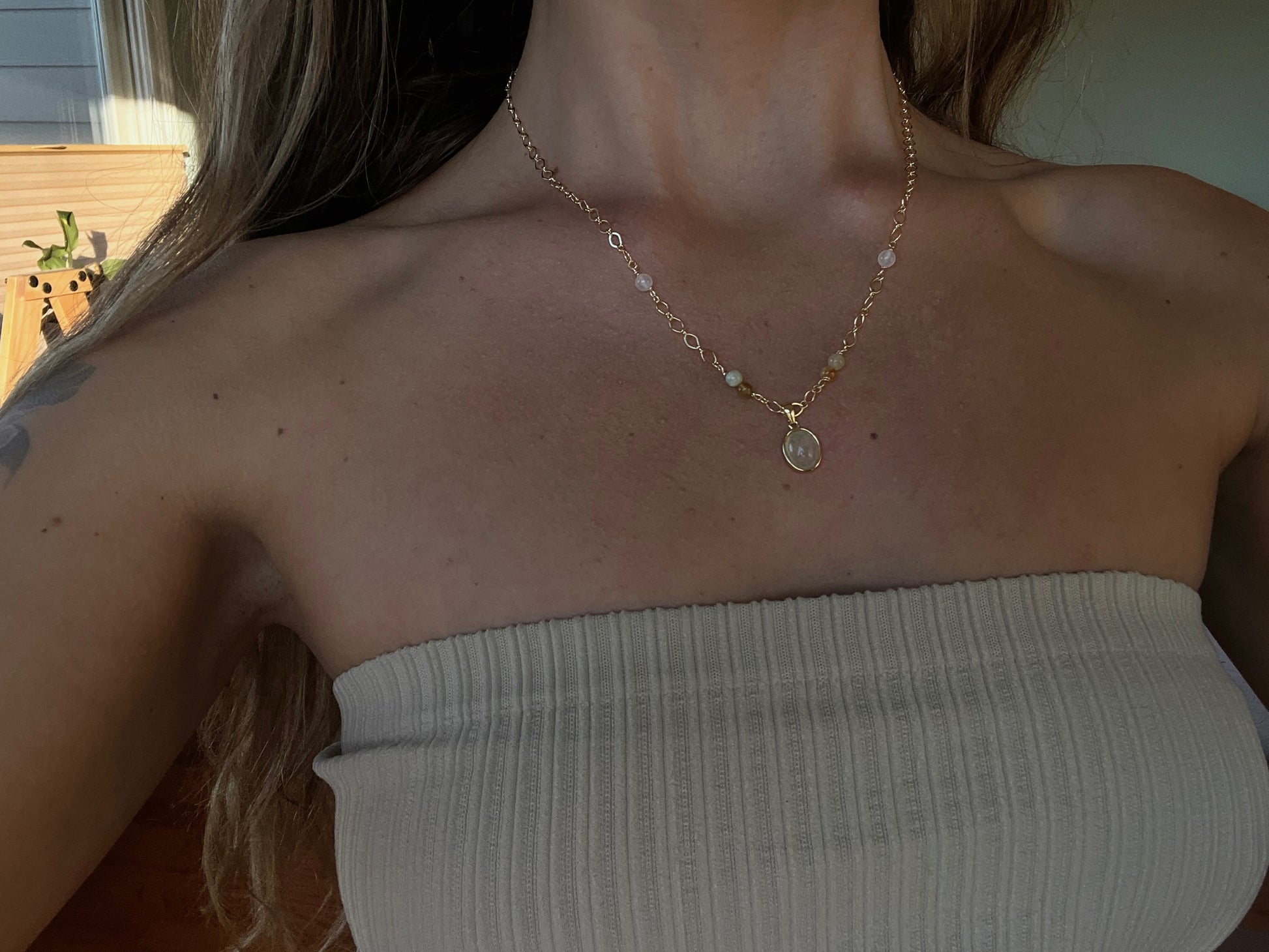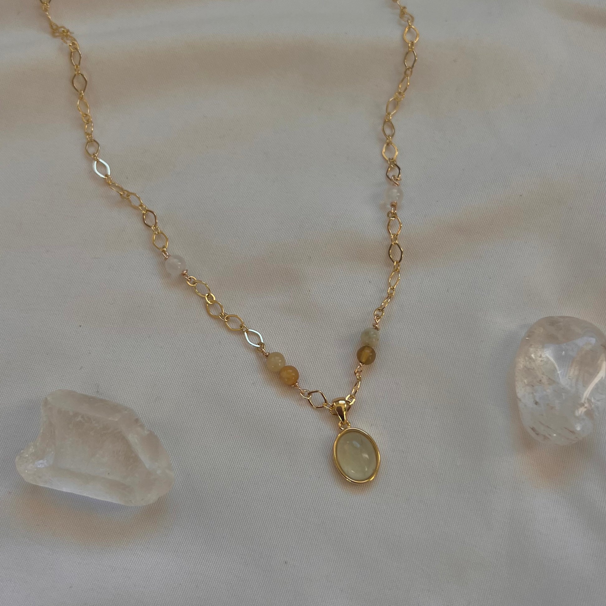 16” adjustable gold filled chain with flower jade, selenite, & peridot pendant