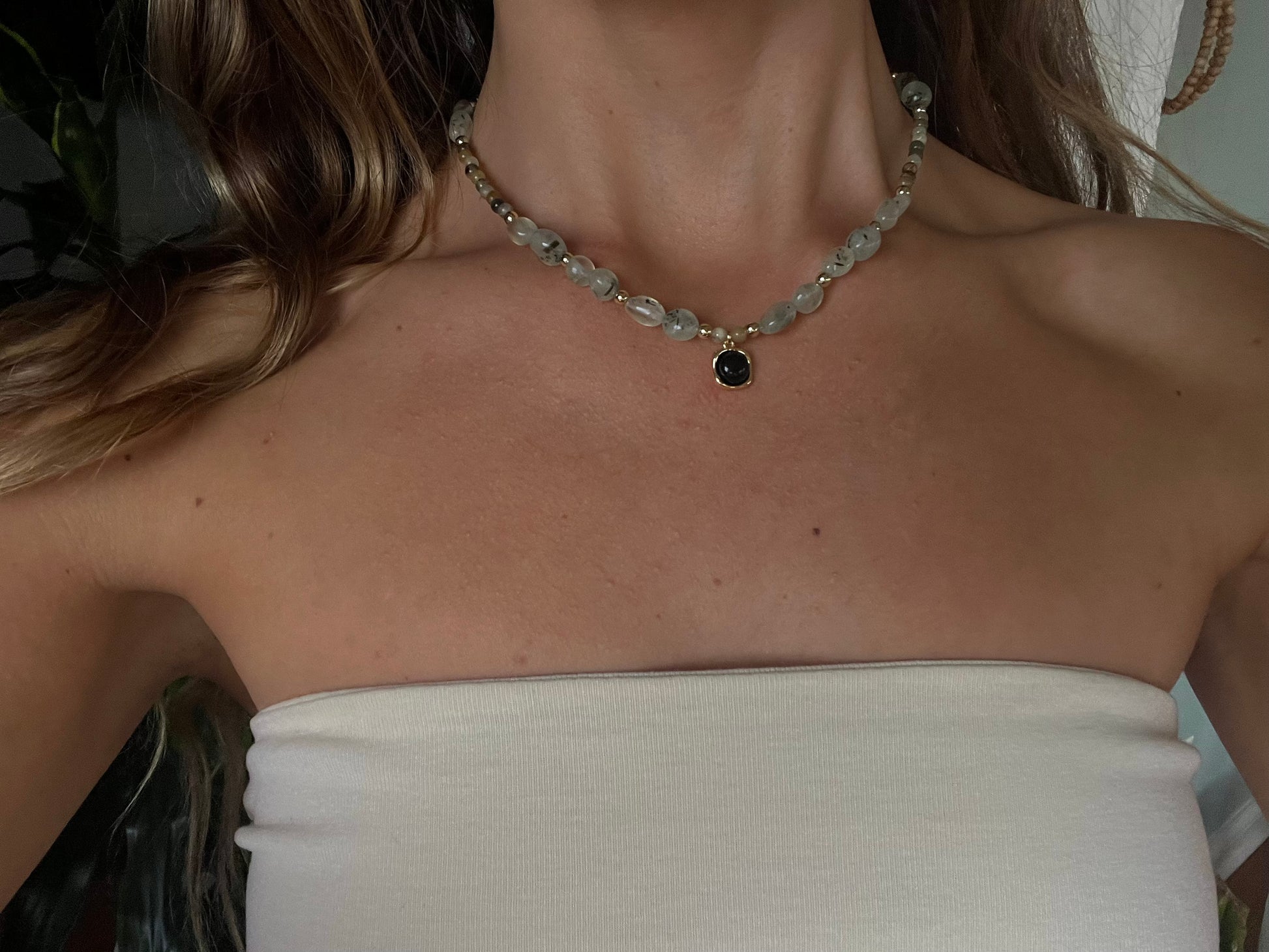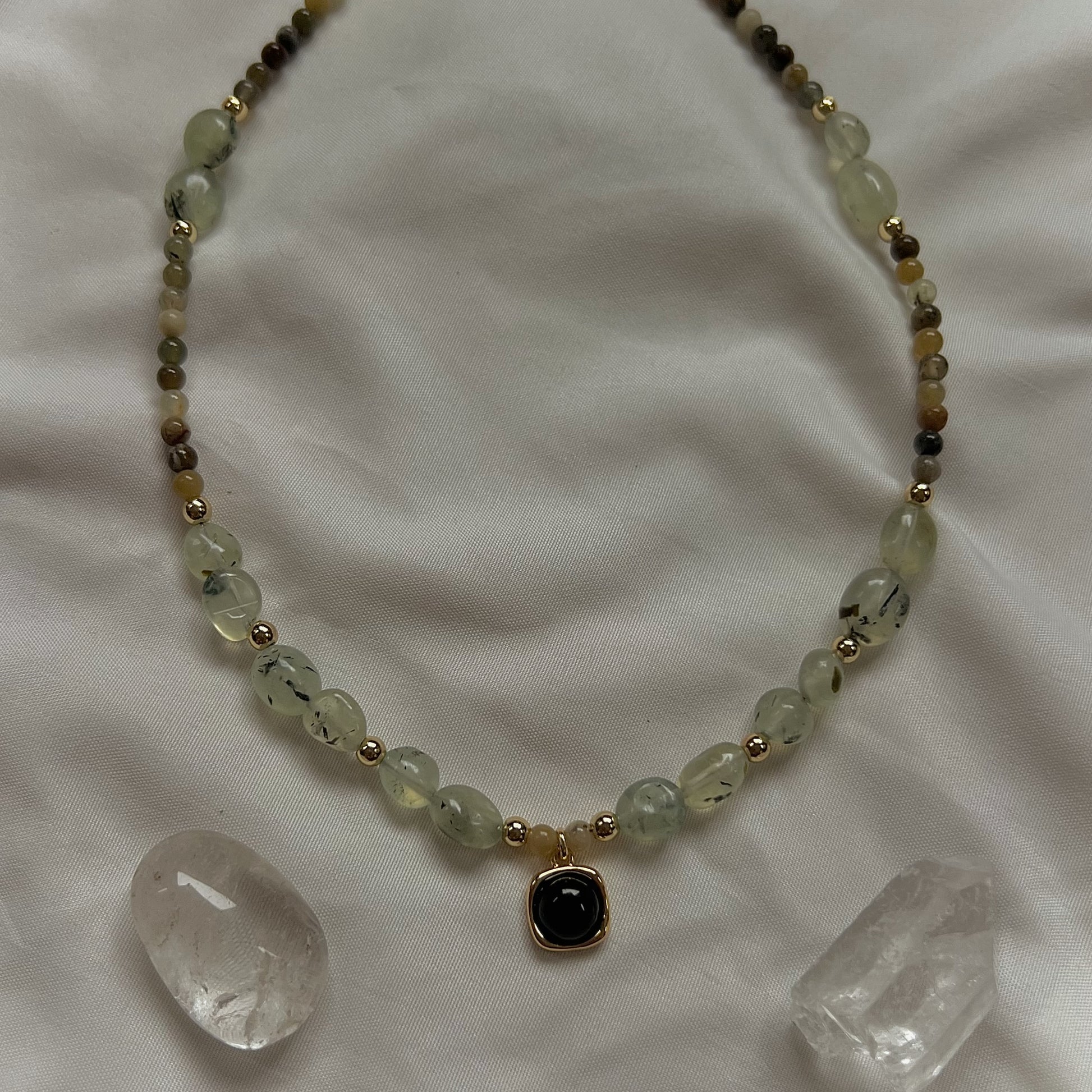 15” adjustable beaded necklace with flower jade, prehnite, and black onyx charm