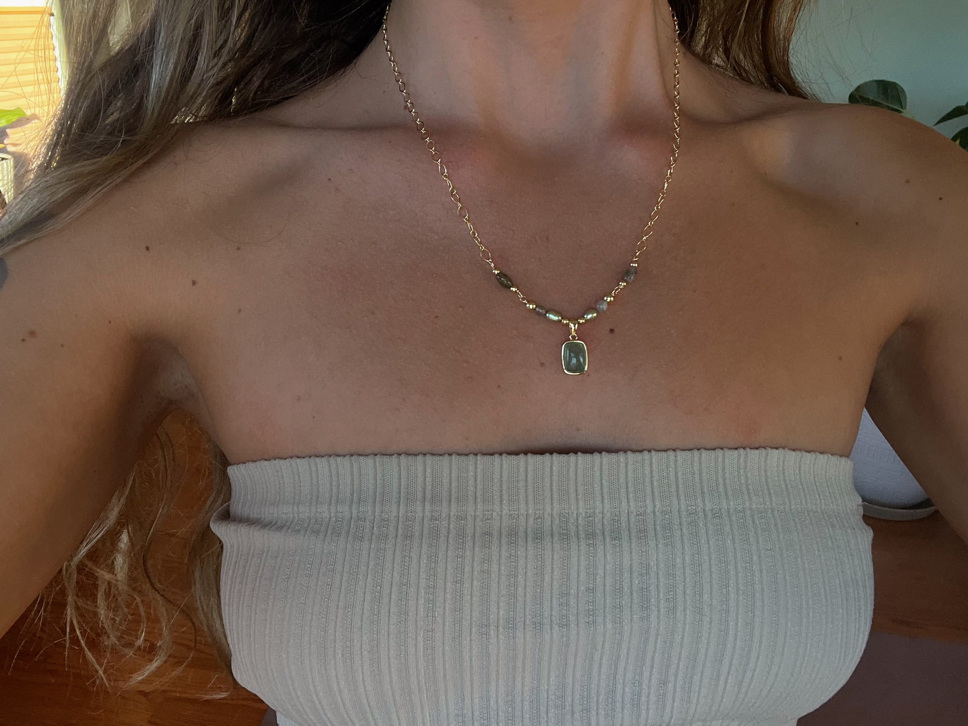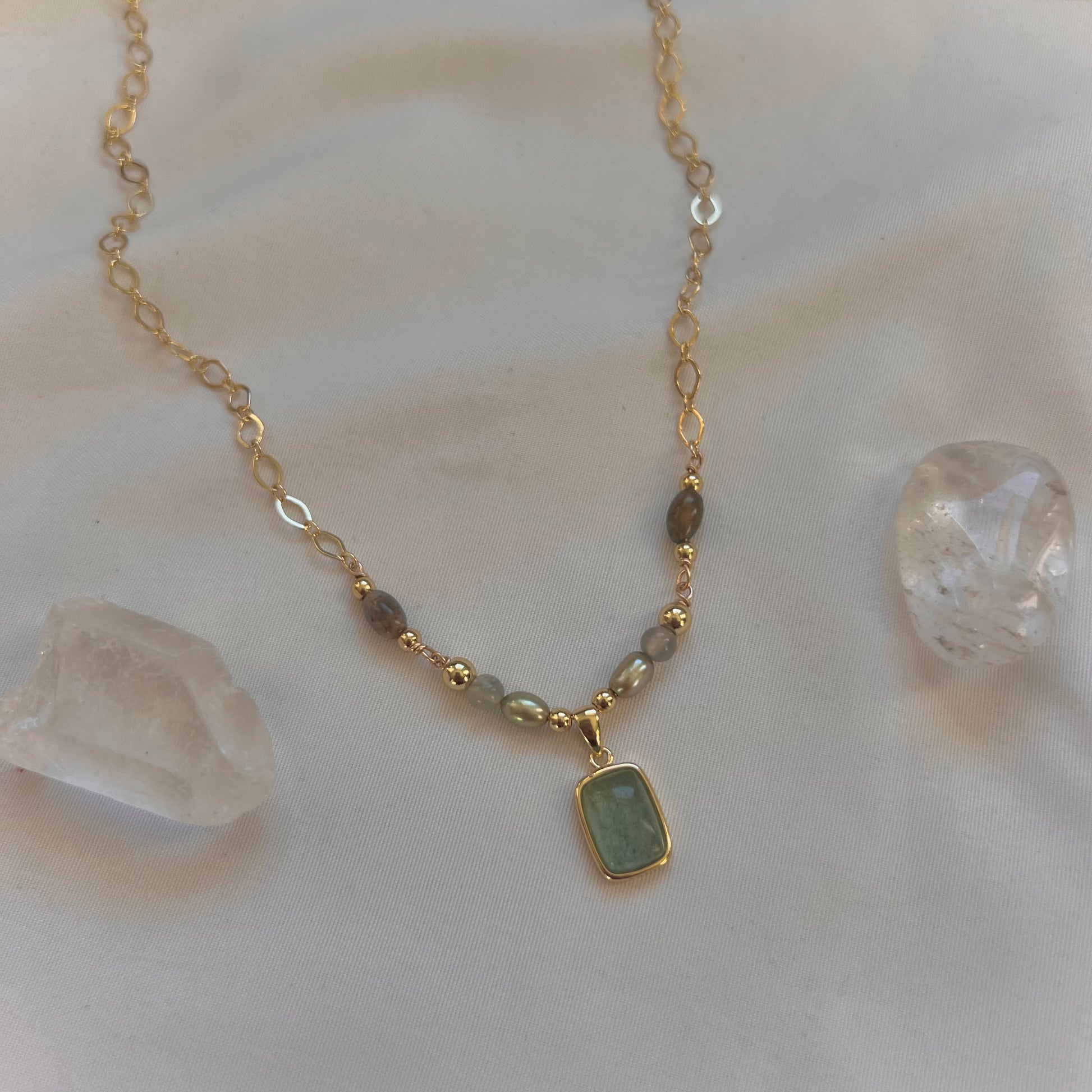 17” adjustable gold filled necklace with fresh water pearls, fancy jasper and green kyanite pendant