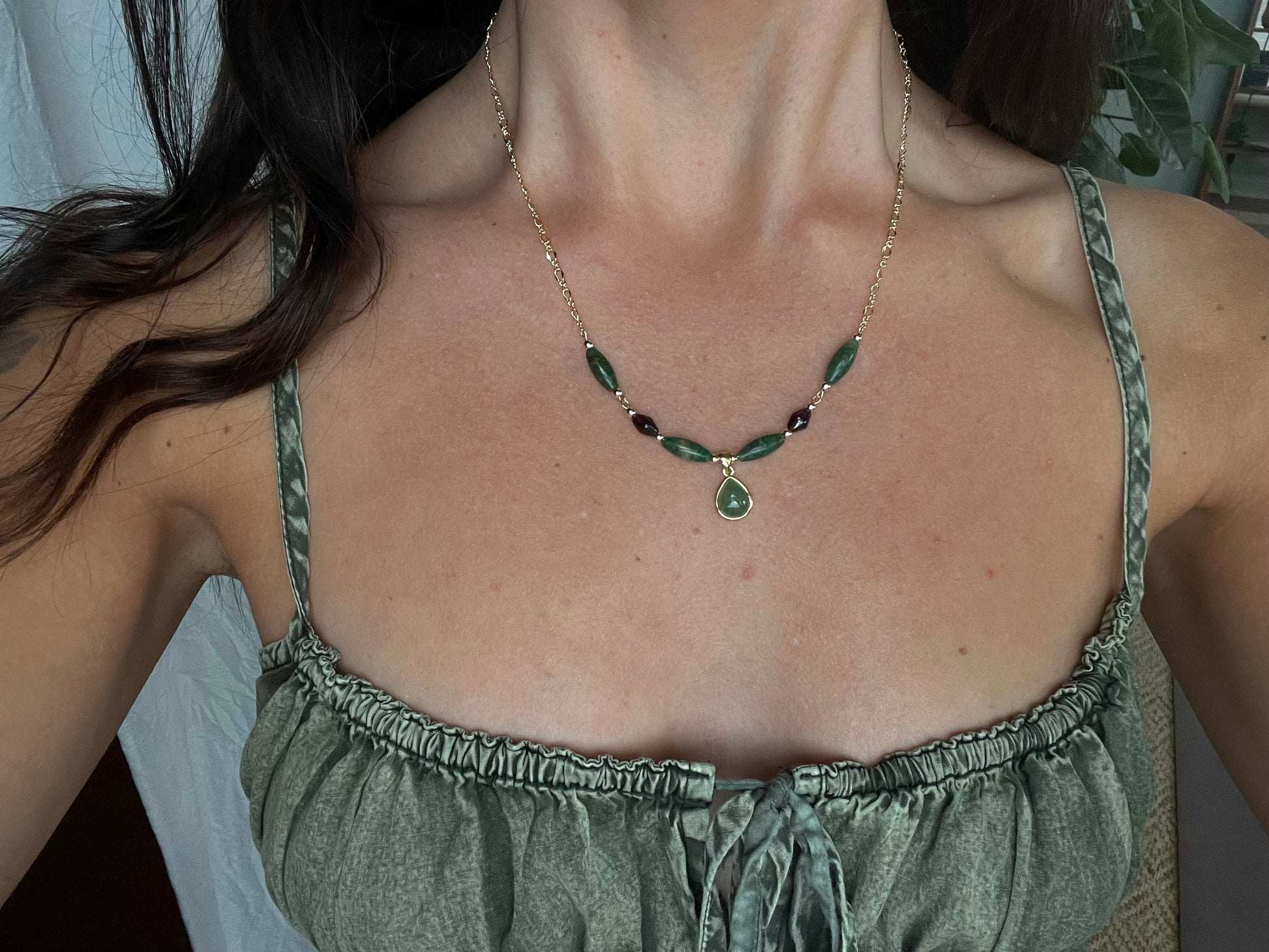 16” adjustable gold filled necklace with african jade, garnet, & aventurine charm