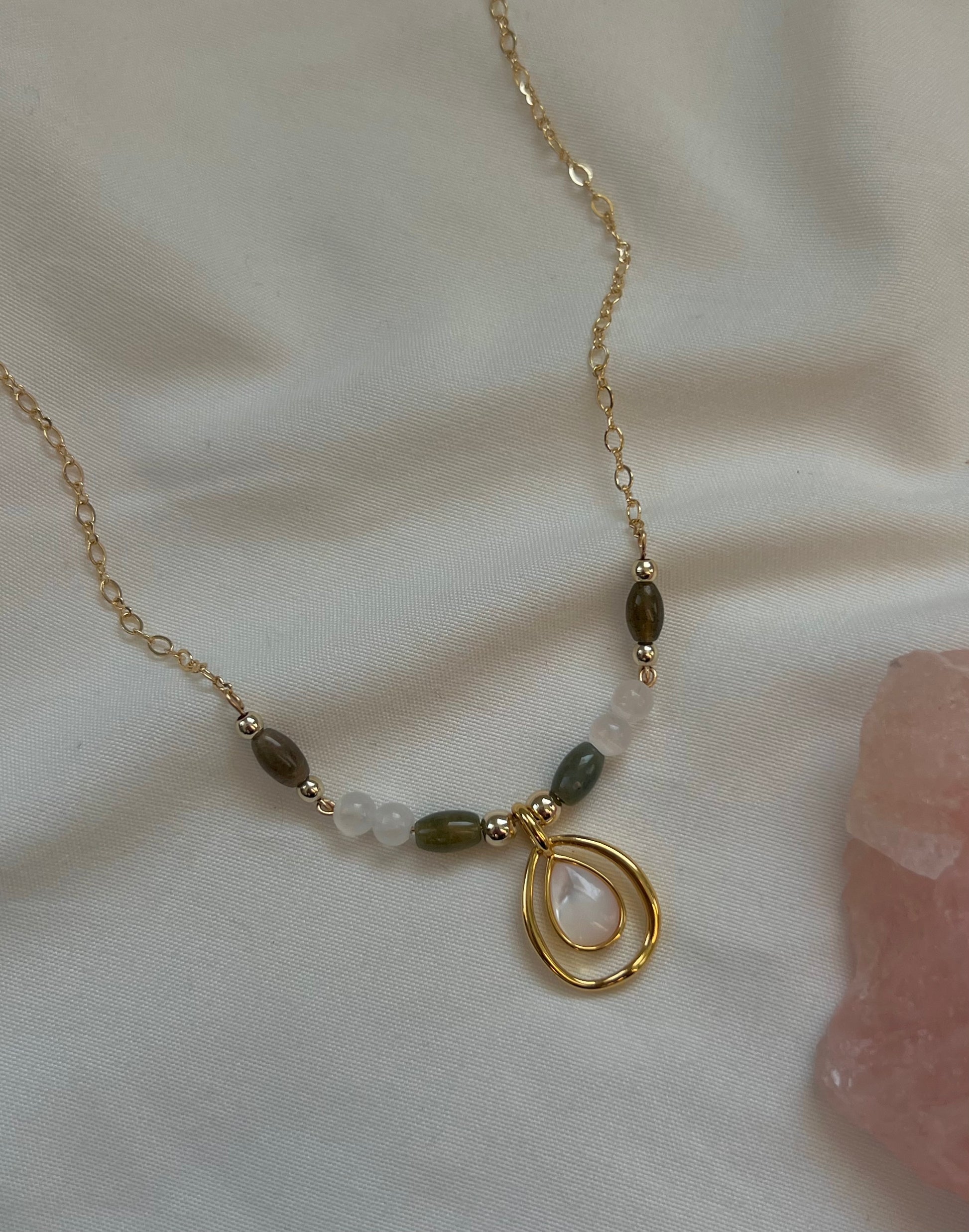 16” adjustable gold filled necklace with indian agate, selenite & fresh water pearl pendant