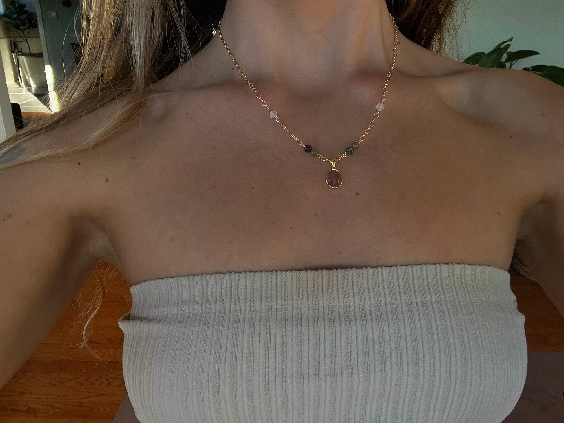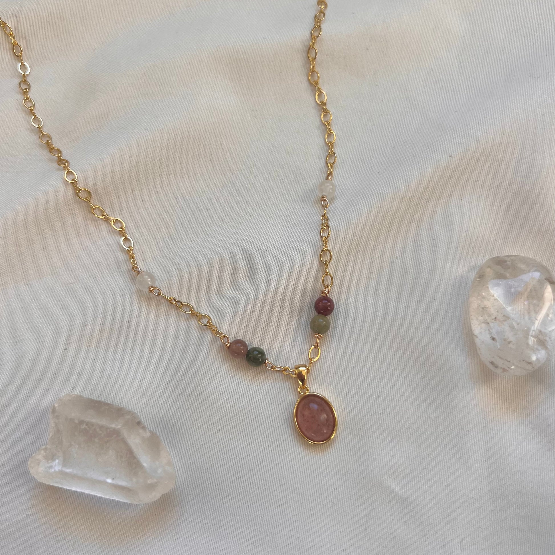 16” adjustable gold filled chain with watermelon tourmaline, selenite, and pink quartz pendant