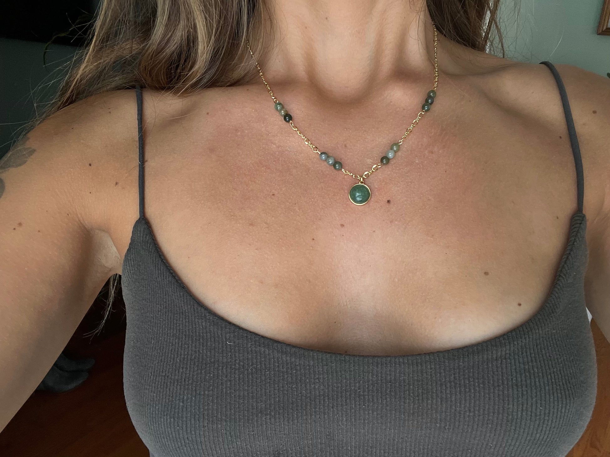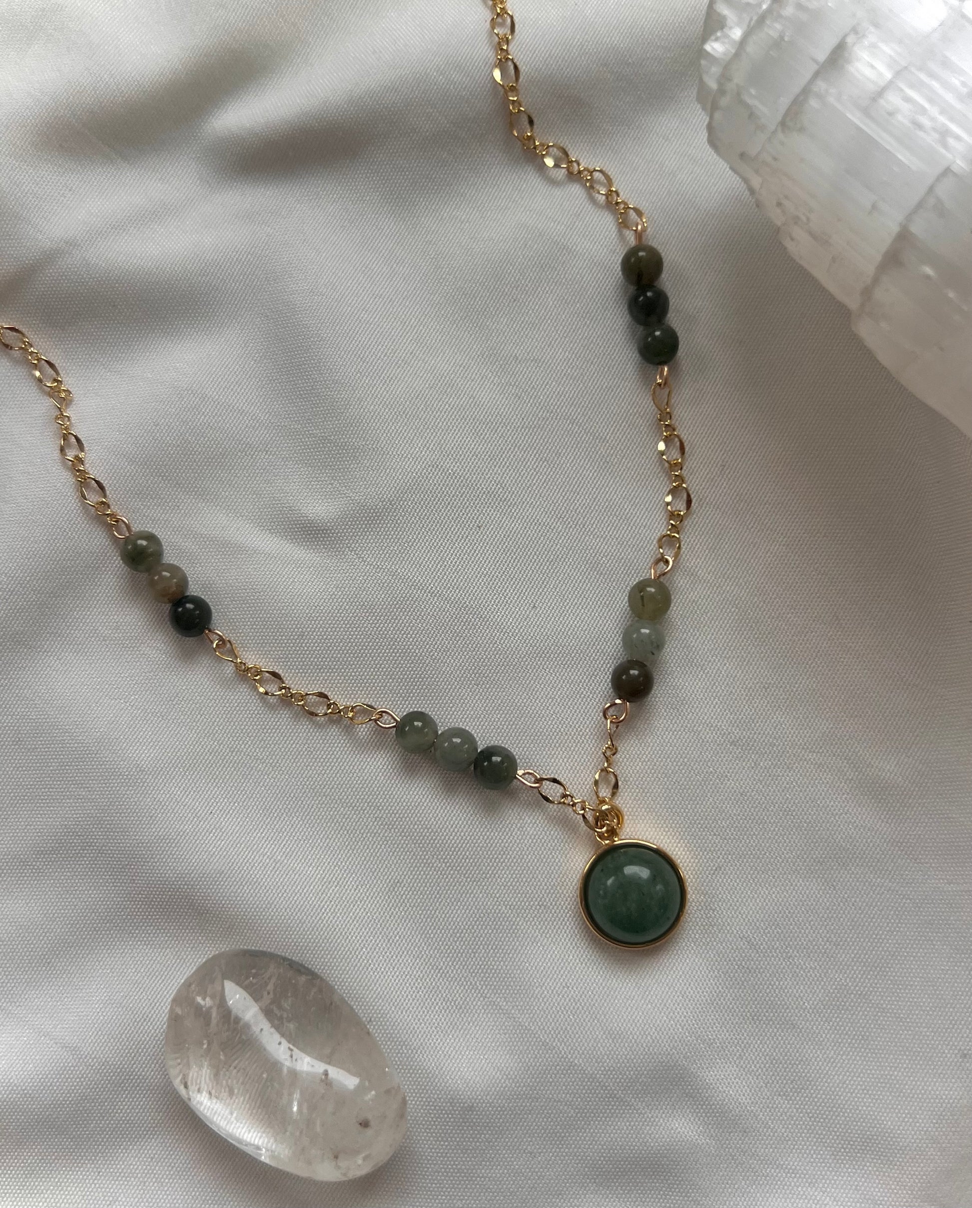 16” adjustable chain with Mongolian Jade beads & Green Aventurine pendant