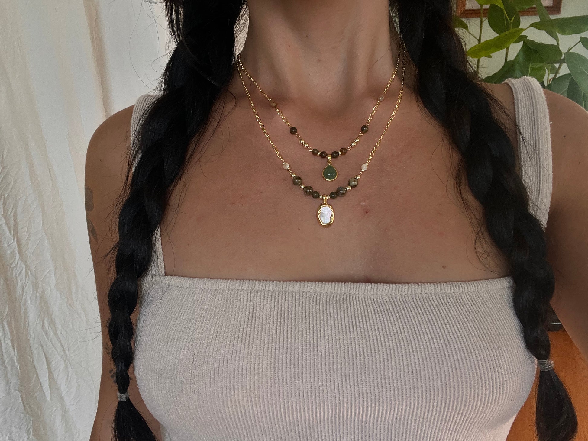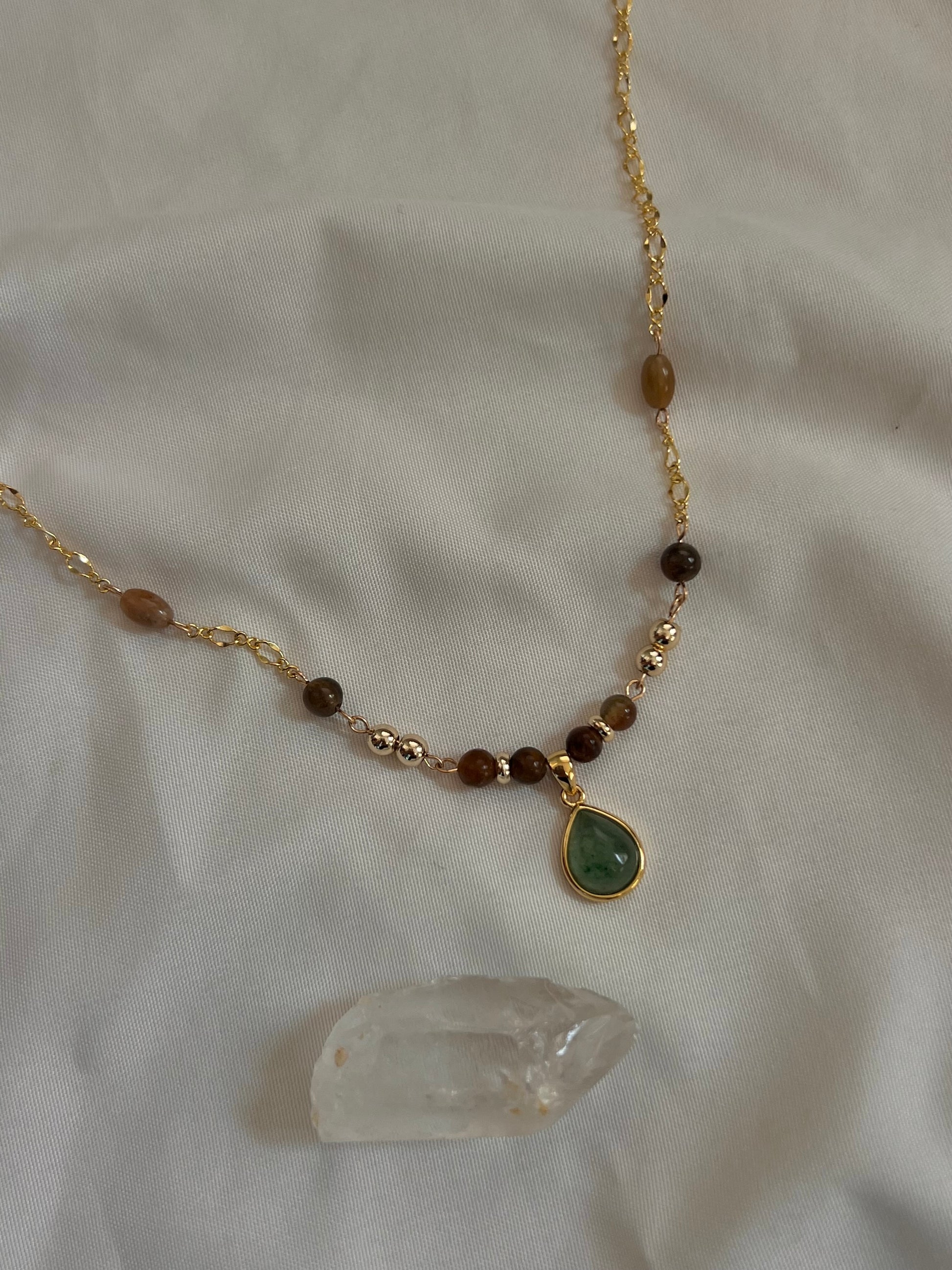 16” adjustable gold filled necklace with aventurine teardrop pendant, flower jade & indian agate beads