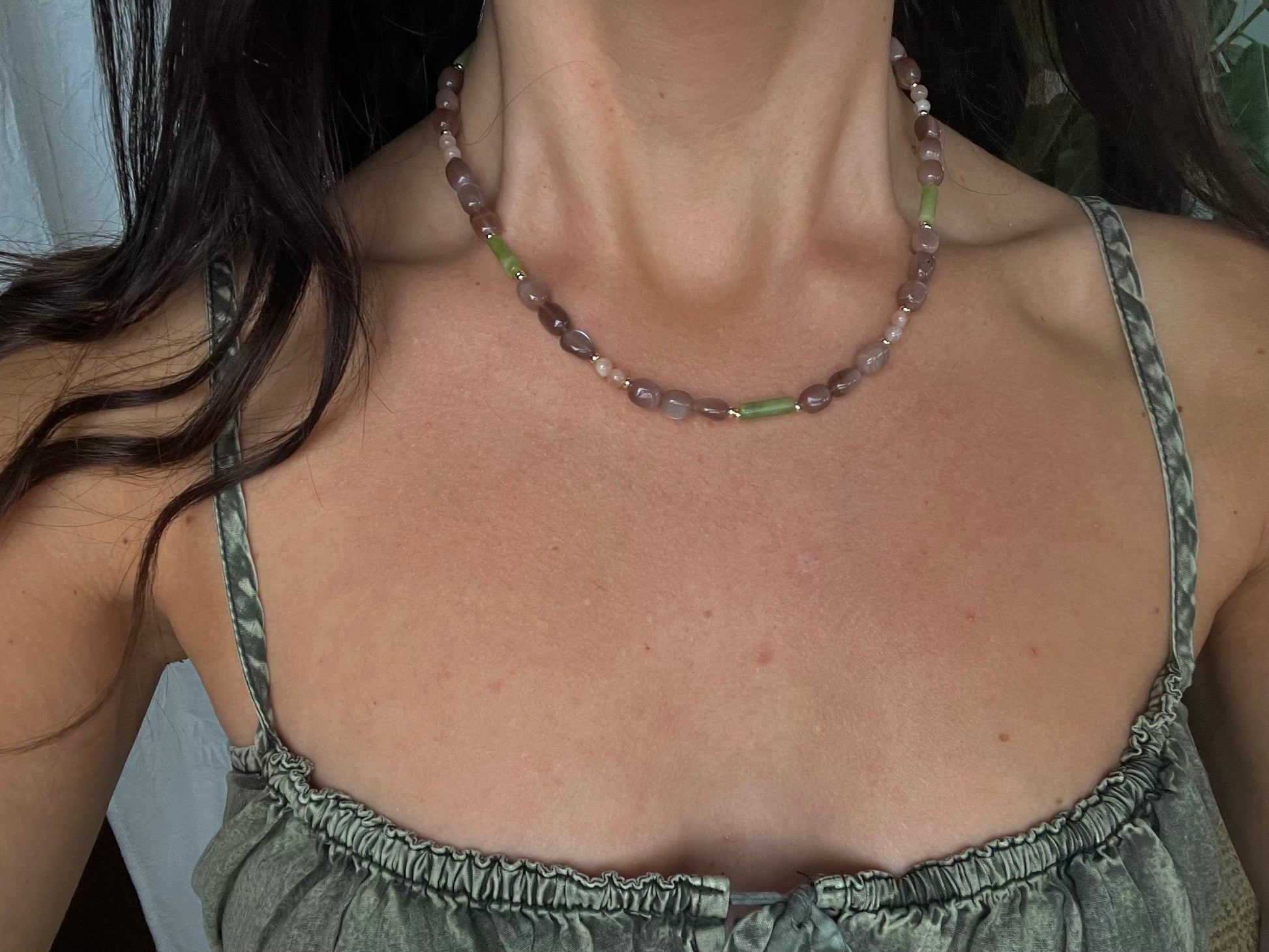 16” gold filled beaded sunstone & canadian jade necklace